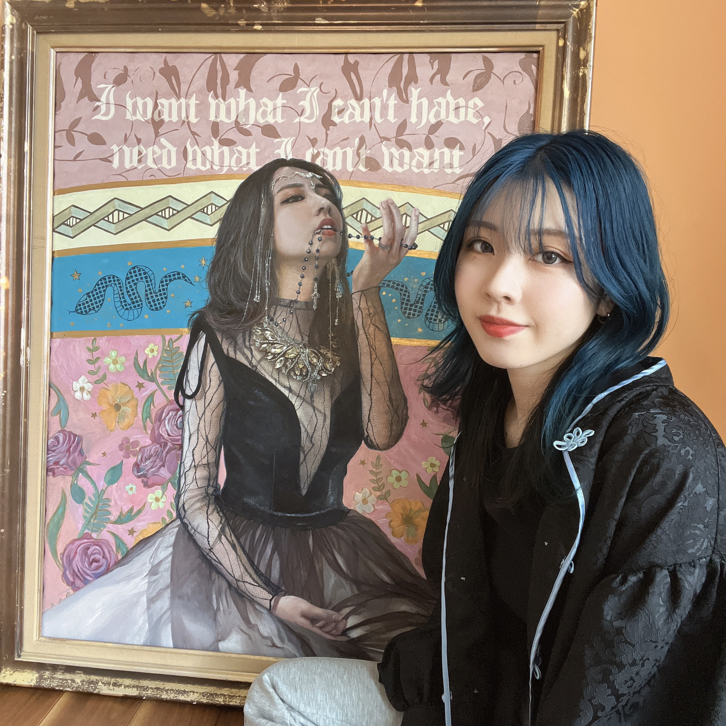 2001年神奈川県生まれ。2022年東京女子美術大学短期大学部メディアデザインコース卒業。実験的な表現や退廃的なものからインスピレーションを受け、それらを日々の思考と感情に共有させ落とし込んだ作品を制作する。ひとつの作品に、アクリルやクレヨン、ラテックス、グルーガンなど様々な性質の画材を用いることも特徴的。