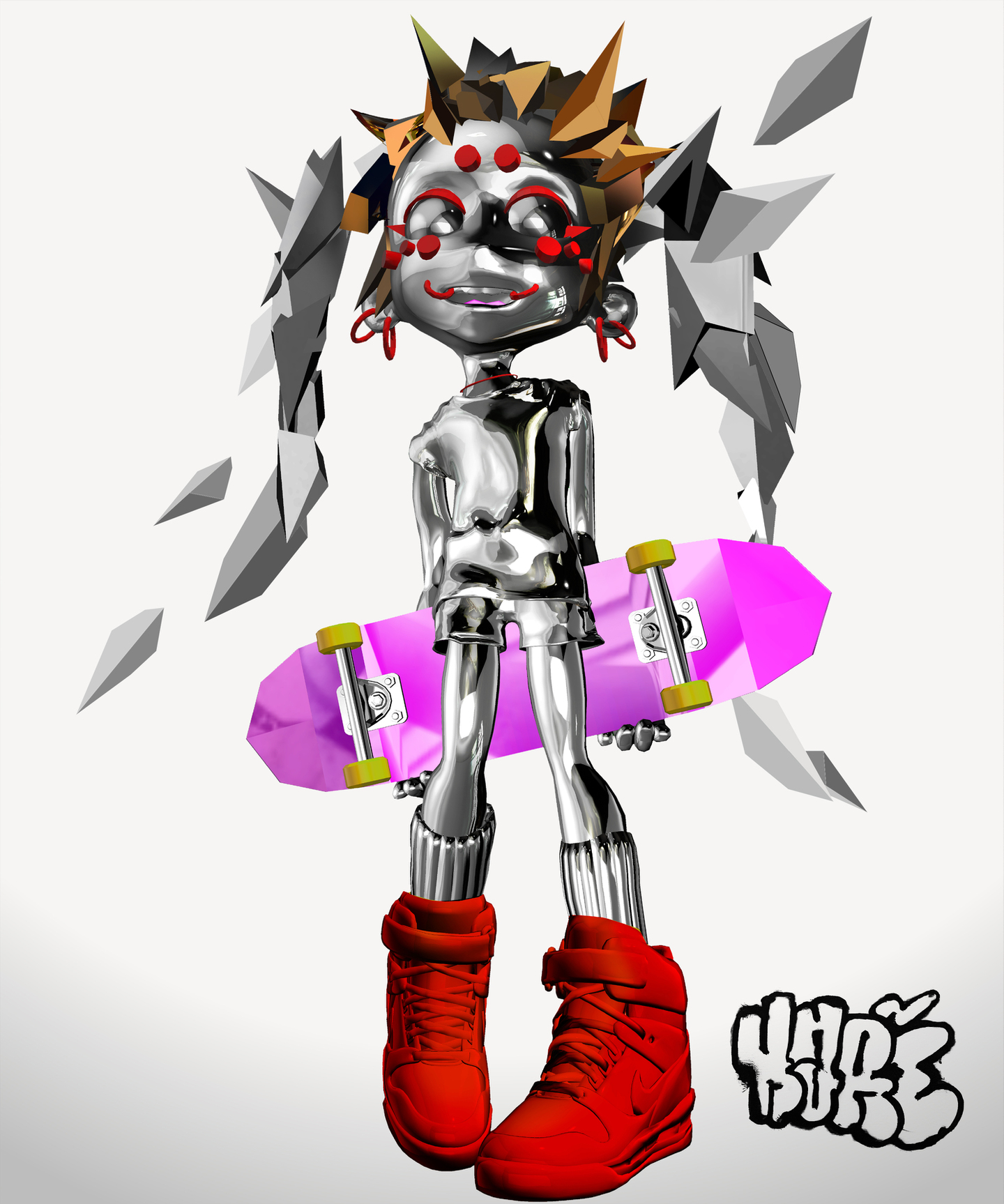 彼はスケートボード、グラフティ、ストリートカルチャー ,クラブミュージックをバックボーンに持ち、ウェアブランド NUJABES 主催 ”TRIBE"や、 DOBERMAN inc. "DMN"、などのグラフィックデザインを担当。