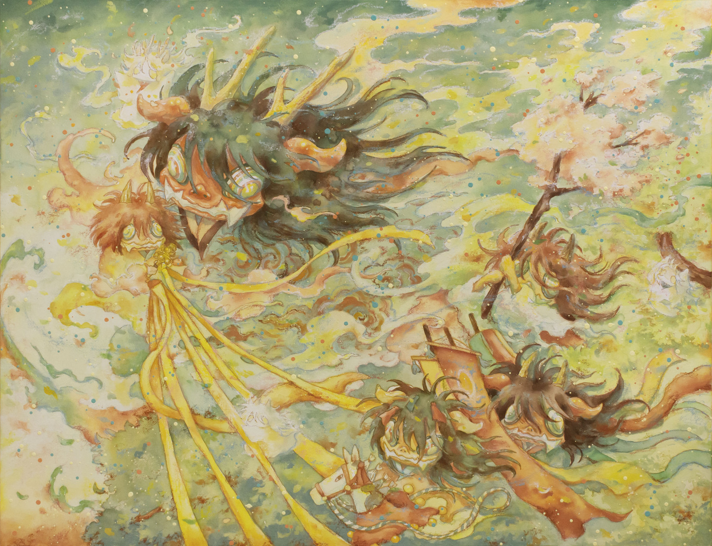 作品の中では強い色彩と柔らかな線が共存し、祝祭性と静けさが同時に立ち上がる。